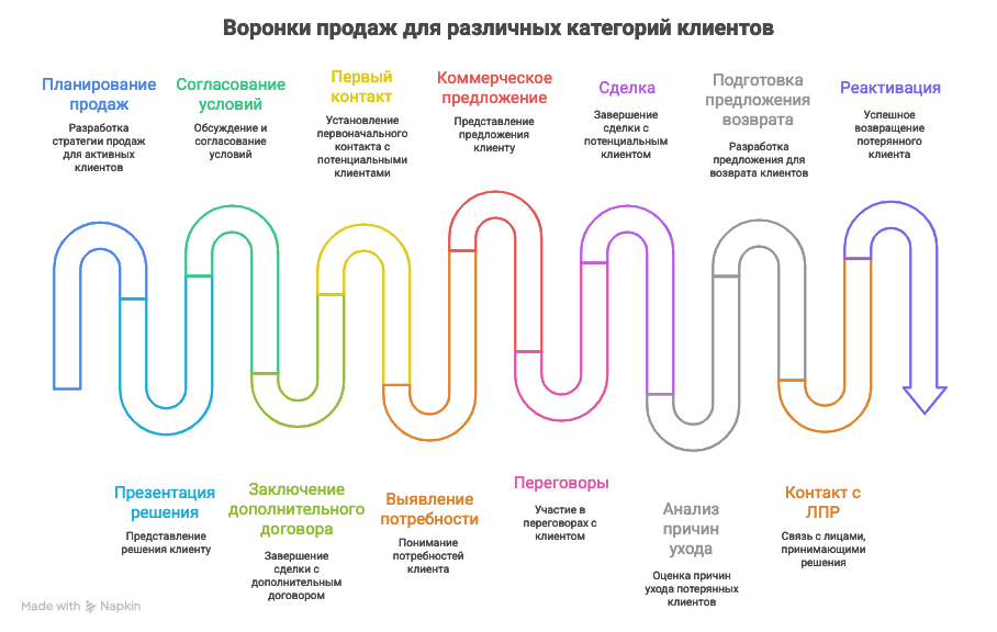 Для активных клиентов воронка может включать этапы: "Планирование продаж" → "Презентация решения" → "Согласование условий" → "Заключение дополнительного договора". Для потенциальных: "Первый контакт" → "Выявление потребности" → "Коммерческое предложение" → "Переговоры" → "Сделка".